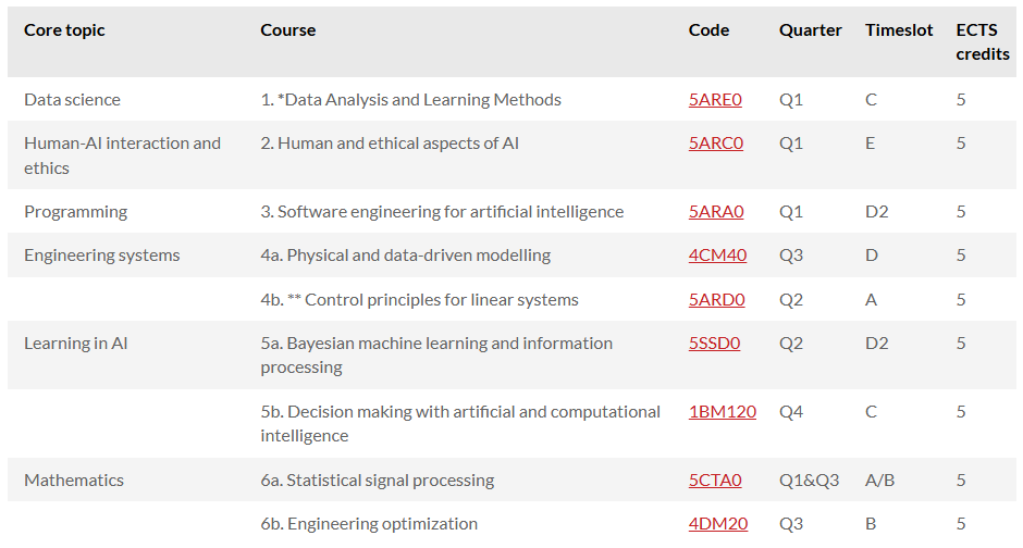 TLDR; register for courses Data Analysis and Learning Methods (5ARE0), Human and ethical aspects of AI (5ARC0) and Software engineering for artificial intelligence (5ARA0).