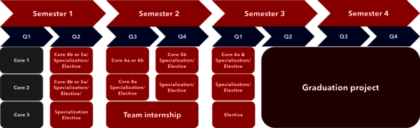As we can see, the master lasts 2 years and each year has 4 quartiles (Q1, Q2, Q3, Q4). In total, there are 6 core courses. All the core courses are: